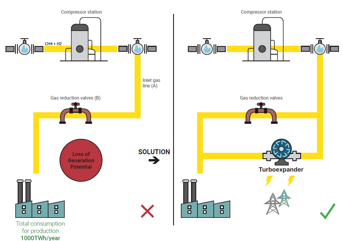 European industries obtain about 1000TWh of energy annually by burning natural gas. This gas is transmitted via pressurized pipelines and while the pressure is reduced at the user’s gas letdown station, its potential energy is permanently lost.These losses are quantified as 400 MW of installable electric power.